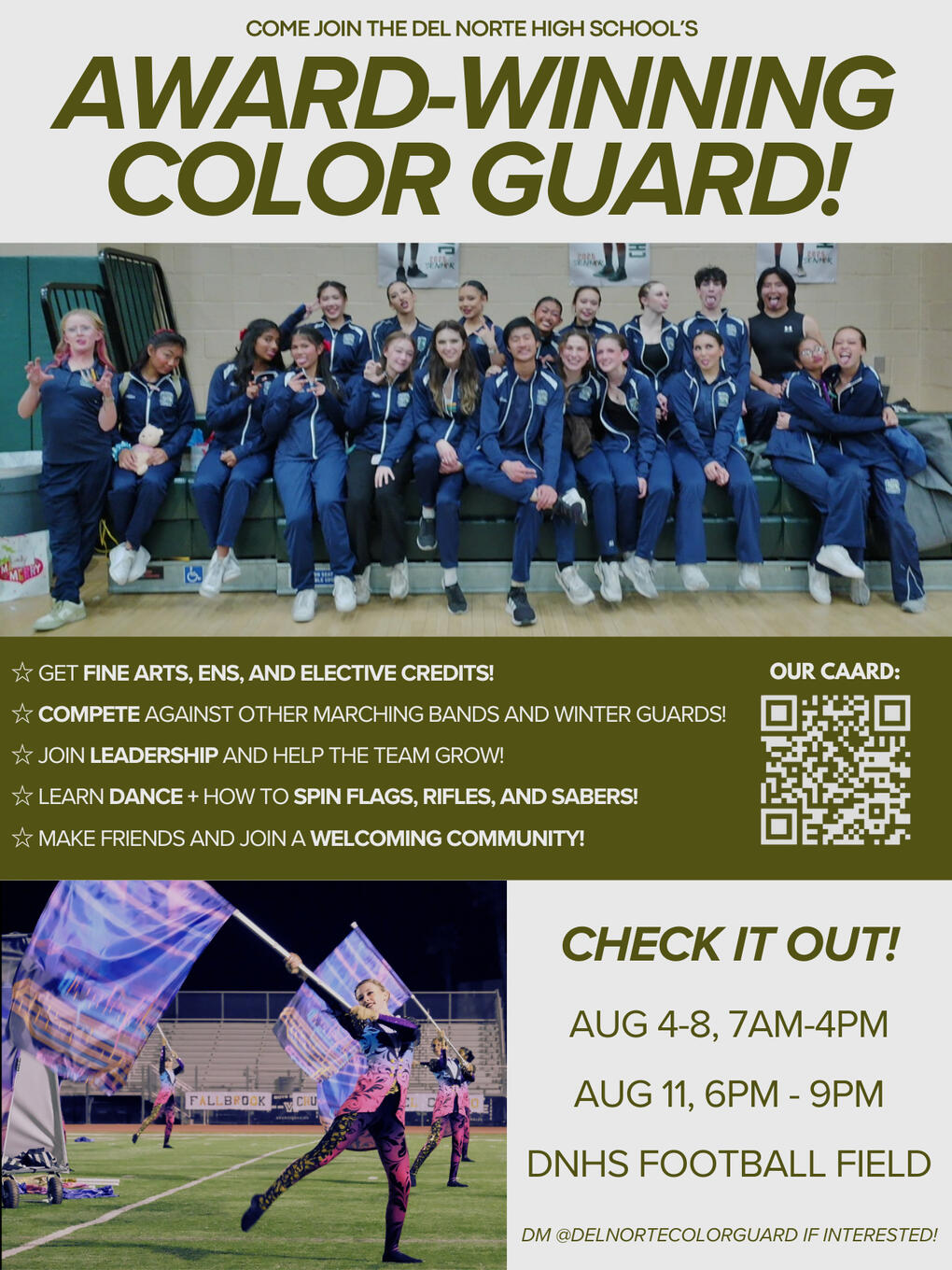 What is Color Guard?Color Guard is a performing art/dance sport and is part of the Del Norte HS Music Program. Our color guard combines dance with props, such as flags, sabres, and rifles.What is a year in Color Guard like?We participate in 3 seasons throughout the school year.