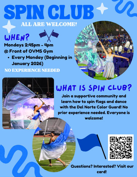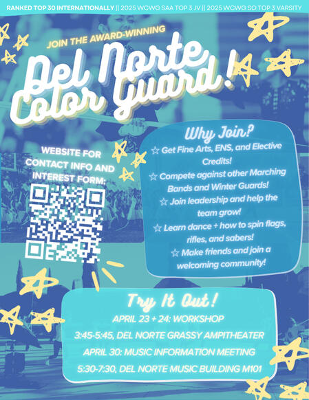What is Color Guard?Color Guard is a performing art/dance sport and is part of the Del Norte HS Music Program. Our color guard combines dance with props, such as flags, sabres, and rifles.What is a year in Color Guard like?We participate in 3 seasons throughout the school year.